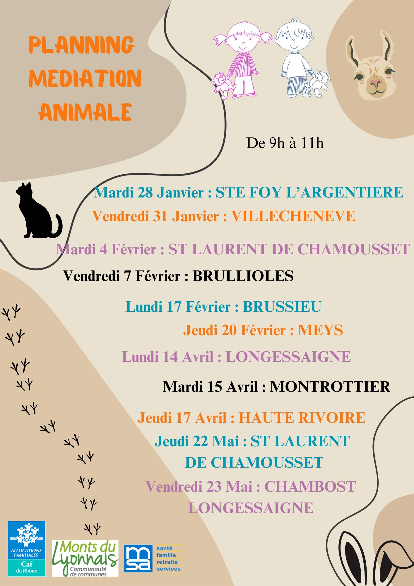 Début à partir de 9h (arrivée possible jusqu’à 9h30) jusqu’à 11h, afin d’éviter des allers et venues et de perturber les animaux et l’intervention proposée.